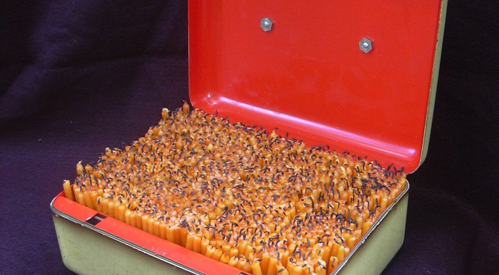 The 21 portraits in pencil and crayon found in this small, red book (6.5 x 7 cm) are a collection of people lying or about to lie down. Ropes, horns, turbans and tails adorn many of the individuals like strange characters from a forgotten, bedtime story. No lies, but lying nonetheless.