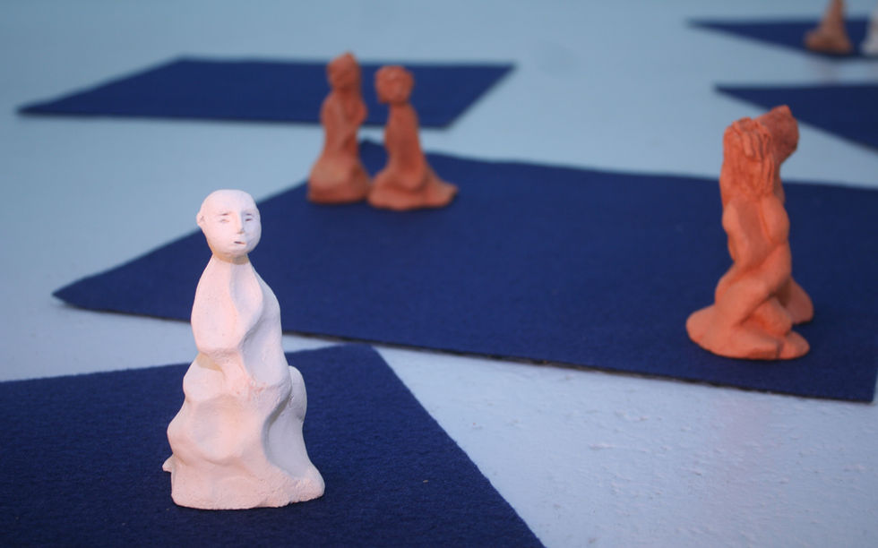 is hosting CREATING HOME (Steps 1-2-3), a solo installation across three large rooms in this villa museum from 7 June to 8 July 2018, concurrently with the World Cup. Inspired both by the architectural drawings displayed at the museum and by her 2015 interactive project with newcomers to Switzerland called WHAT WE DIDN'T LEAVE BEHIND, viewers follow a metaphorical journey creating a new home in a new place. There are three steps to this journey to a new home accompanying 62 small, amorphous figures as they push through a sea of hope-filled balloons, ride a magic carpet of the homes of their dreams, and find themselves in an unfinished city of homes built precariously on the memories and artefacts they brought with them. Materials used: terracotta, latex, ribbon, text, blueprints, cyanotype, cork, paper, felt and original sound.